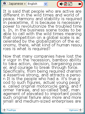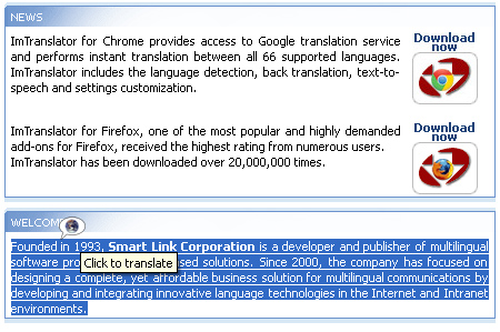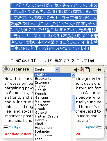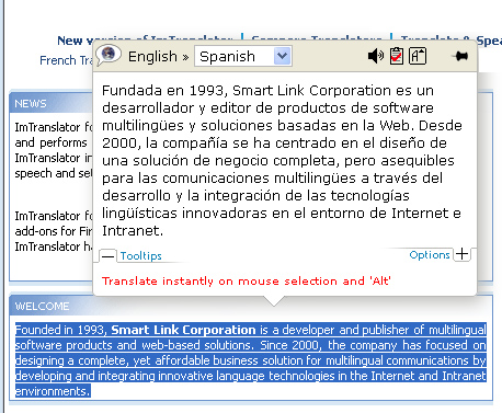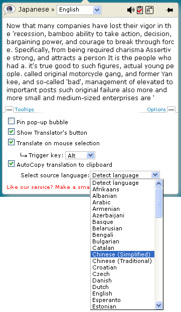 The pop-up bubble translates between 66 languages using Google translation engine.