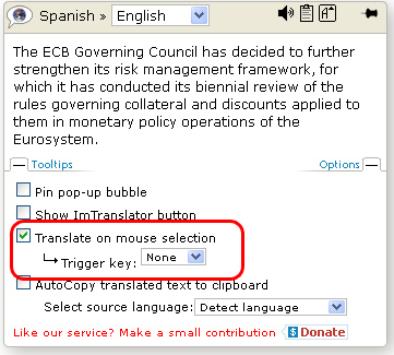 Translate on mouse selection - performs translation by selecting a text with the mouse and using a trigger key. Choose a preferred trigger key from the drop-down list. When choosing “None”, the translation will be completed on mouse selection only.
