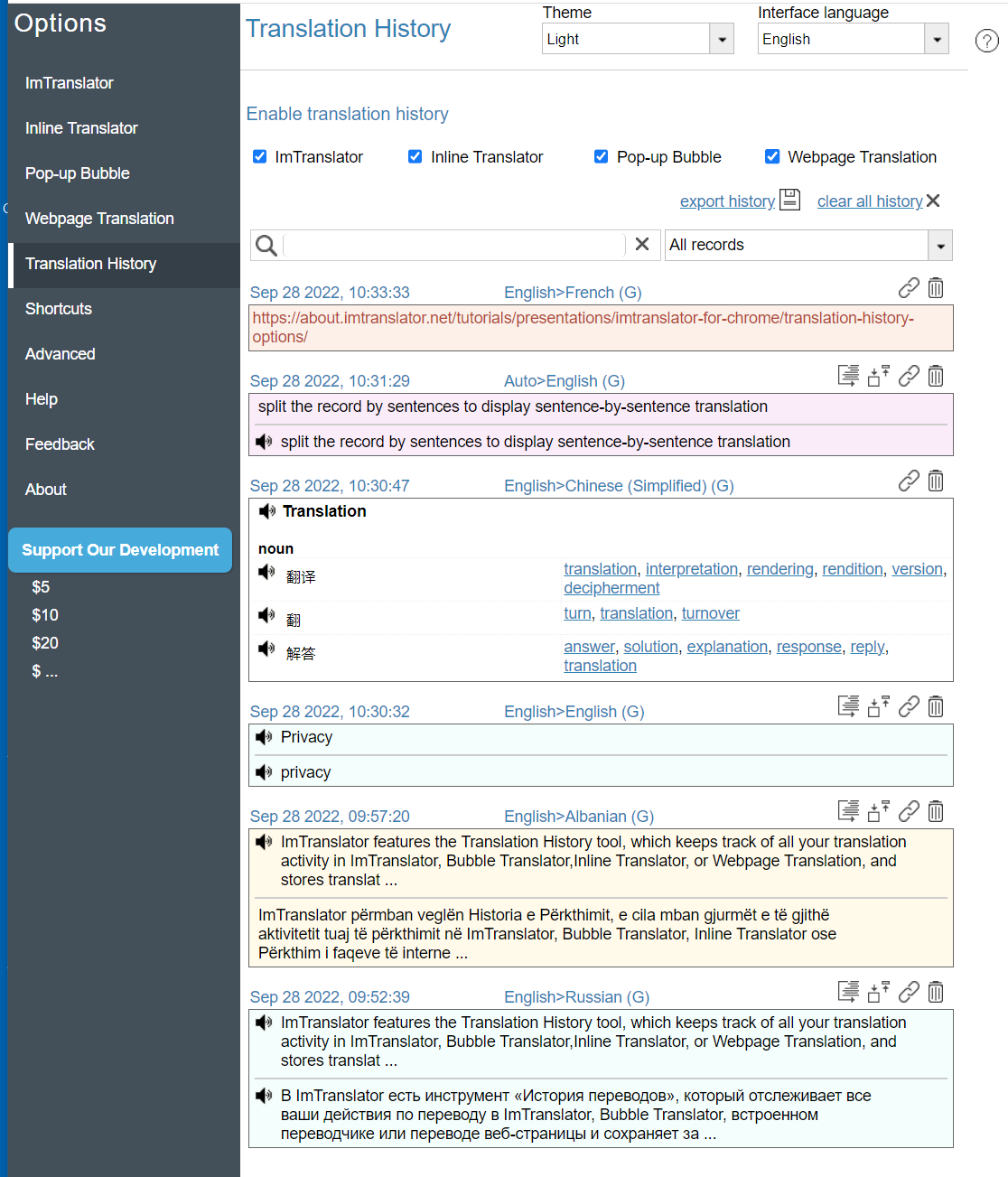 The translation records from ImTranslator, Pop-up Bubble and Inline Translator are stored as the original text with its translation, while the translation history from the Webpage Translation is stored as links to the original page and the translated page.